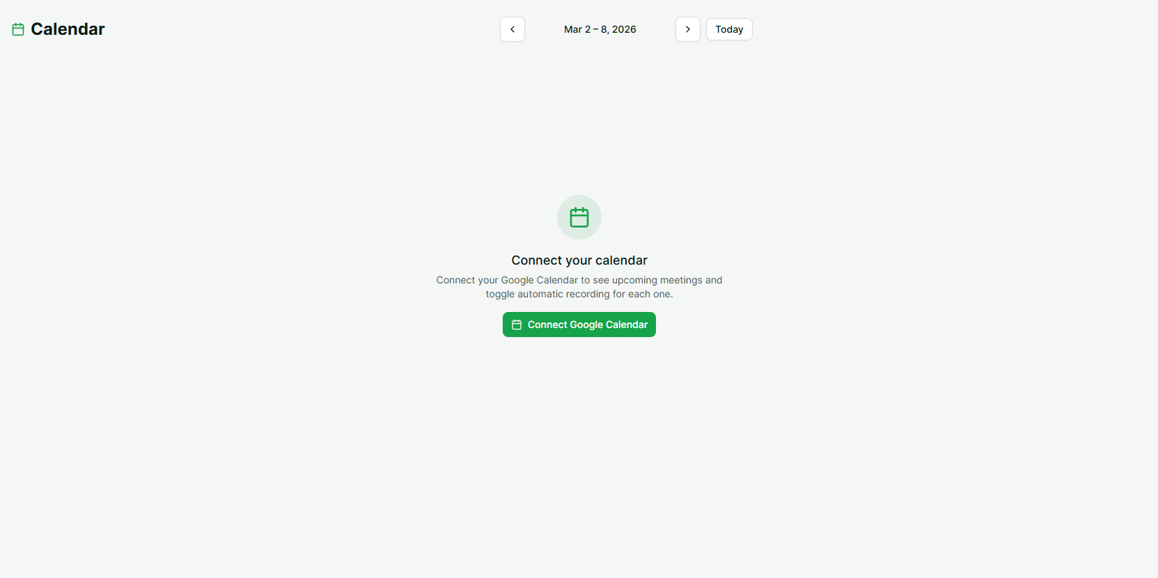 Disconnecting is clean. If you want to remove the integration, go to the Calendar page and click Disconnect. This removes all synced events and the calendar connection. Meetings that were already recorded stay in your Meetings page. Only the calendar link is removed.