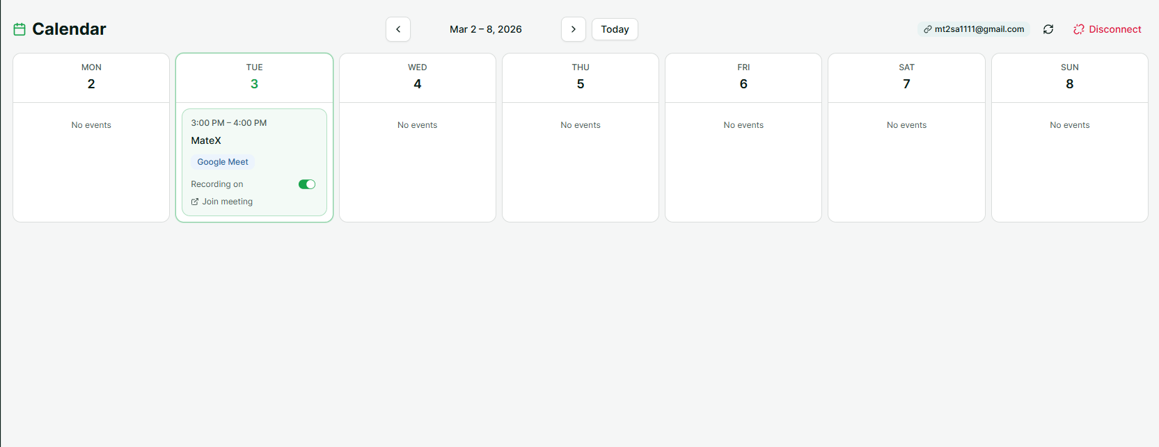 If you have 5+ meetings a day, manually creating each one in MateX gets old fast. The calendar integration fixes this. Connect your Google Calendar once, and you can toggle recording on any upcoming event with a single click.